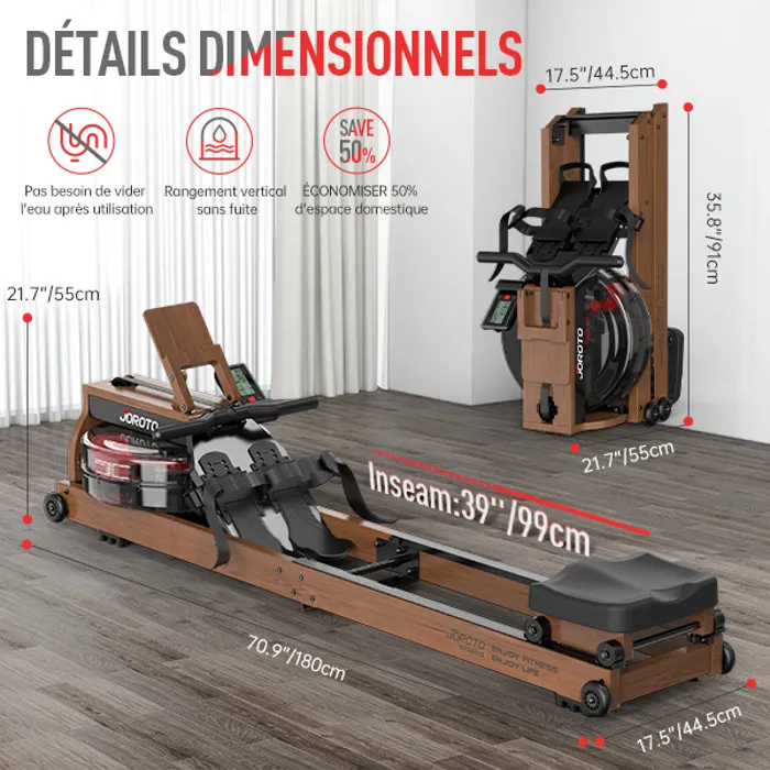 Nom du produit Rameur à eau – JOROTO – MR280Pro – Bois chêne – Écran LCD – Support tablette – Pliable